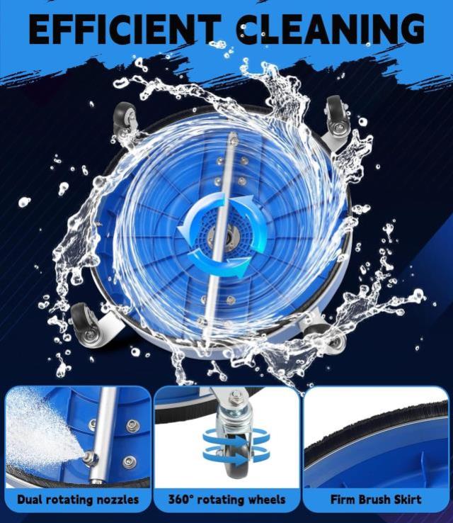 • Commercial-grade pressure washer attachment designed for rapidly cleaning large, flat outdoor areas. It is commonly used for driveways, sidewalks, patios, and decks.